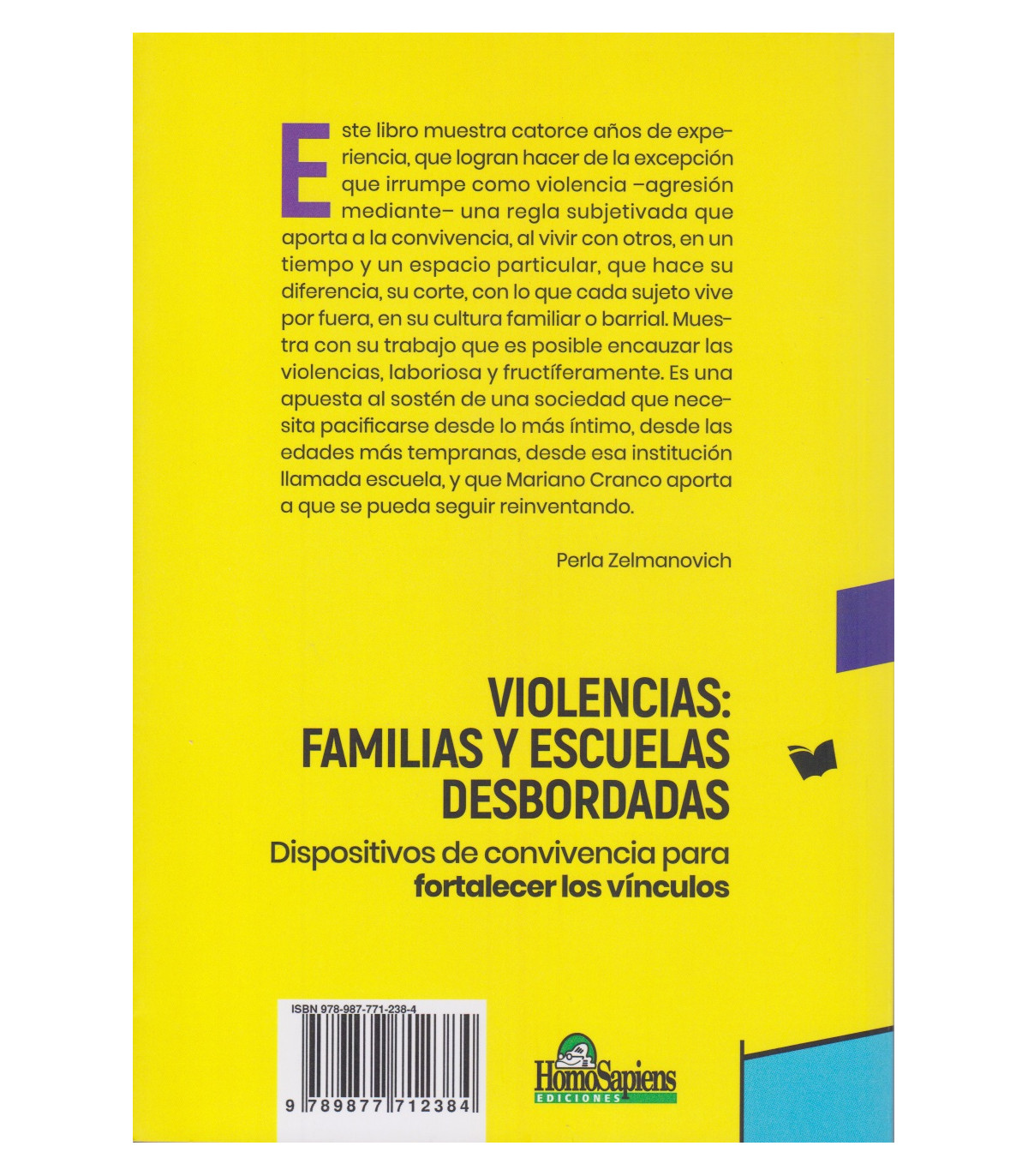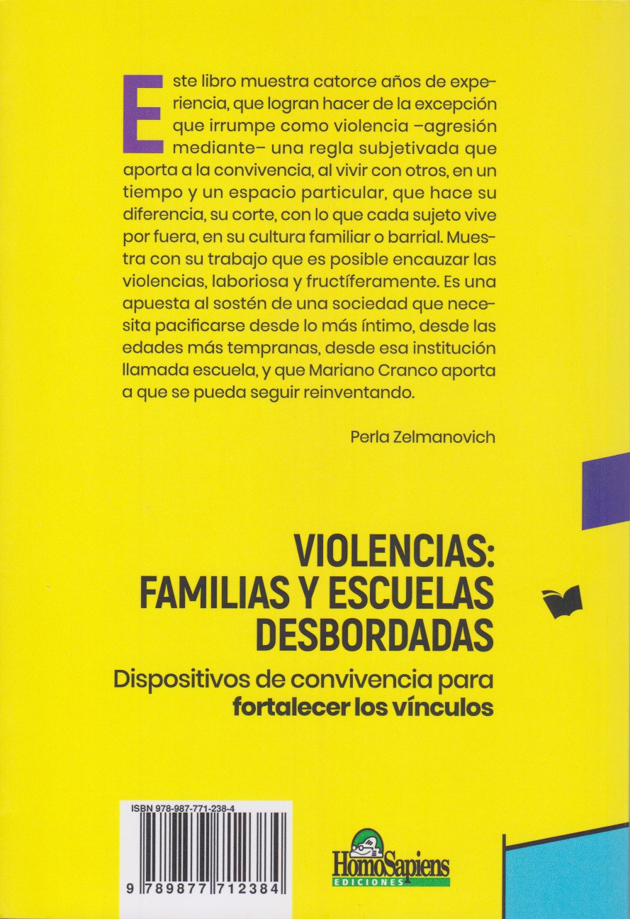 Este libro muestra catorce años de experiencia, que logran hacer de la excepción que irrumpe como violencia –agresión mediante– una regla subjetivada que aporta a la convivencia, al vivir con otros, en un tiempo y un espacio particular, que hace su diferencia, su corte, con lo que cada sujeto vive por fuera, en su cultura familiar o barrial. Muestra con su trabajo, que es posible encauzar las violencias, laboriosa y fructíferamente. Es una apuesta al sostén de una sociedad que necesita pacificarse desde lo más íntimo, desde las edades más tempranas, desde esa institución llamada escuela, y que Mariano Cranco aporta a que se pueda seguir reinventando. Perla Zelmanovich