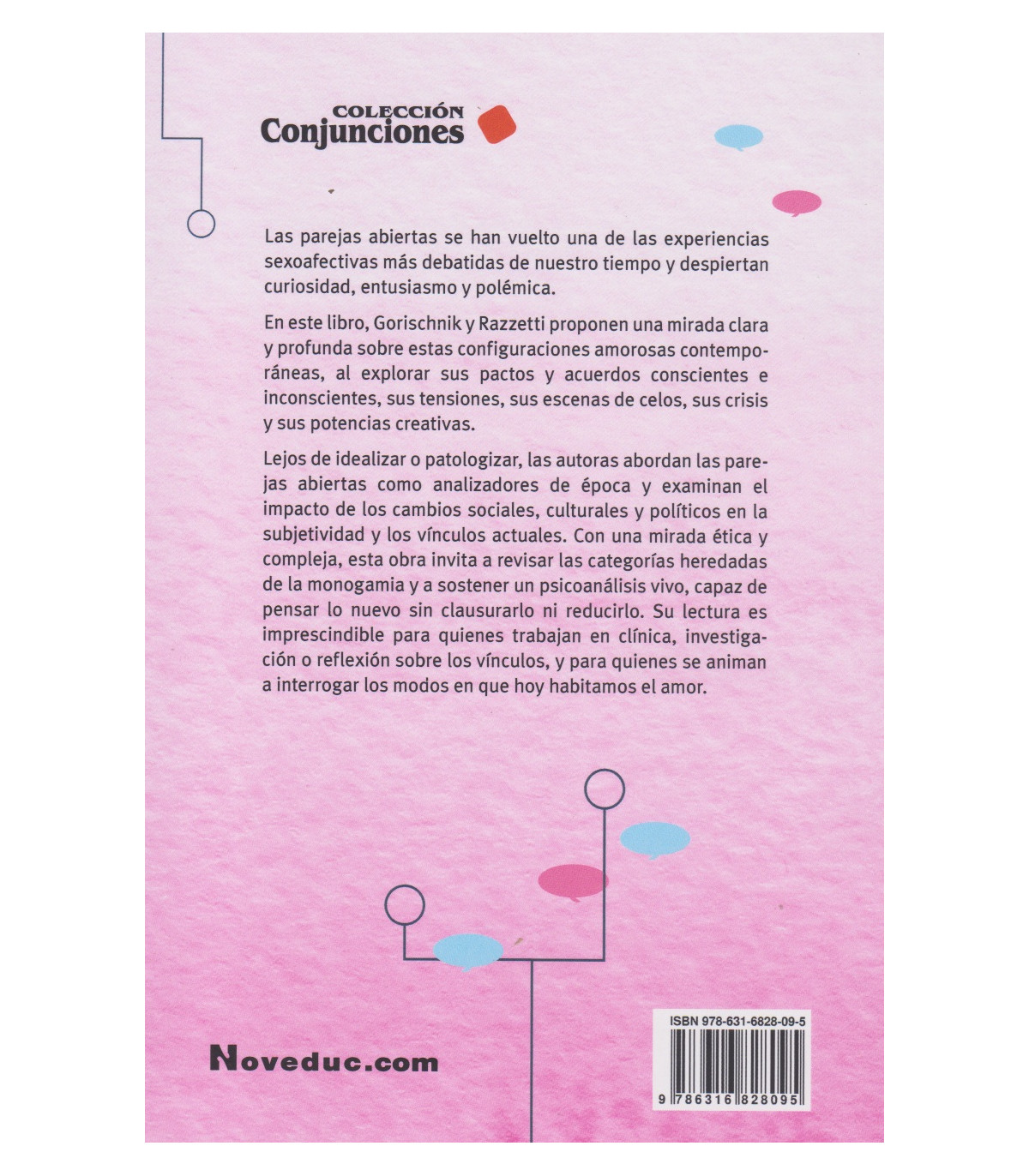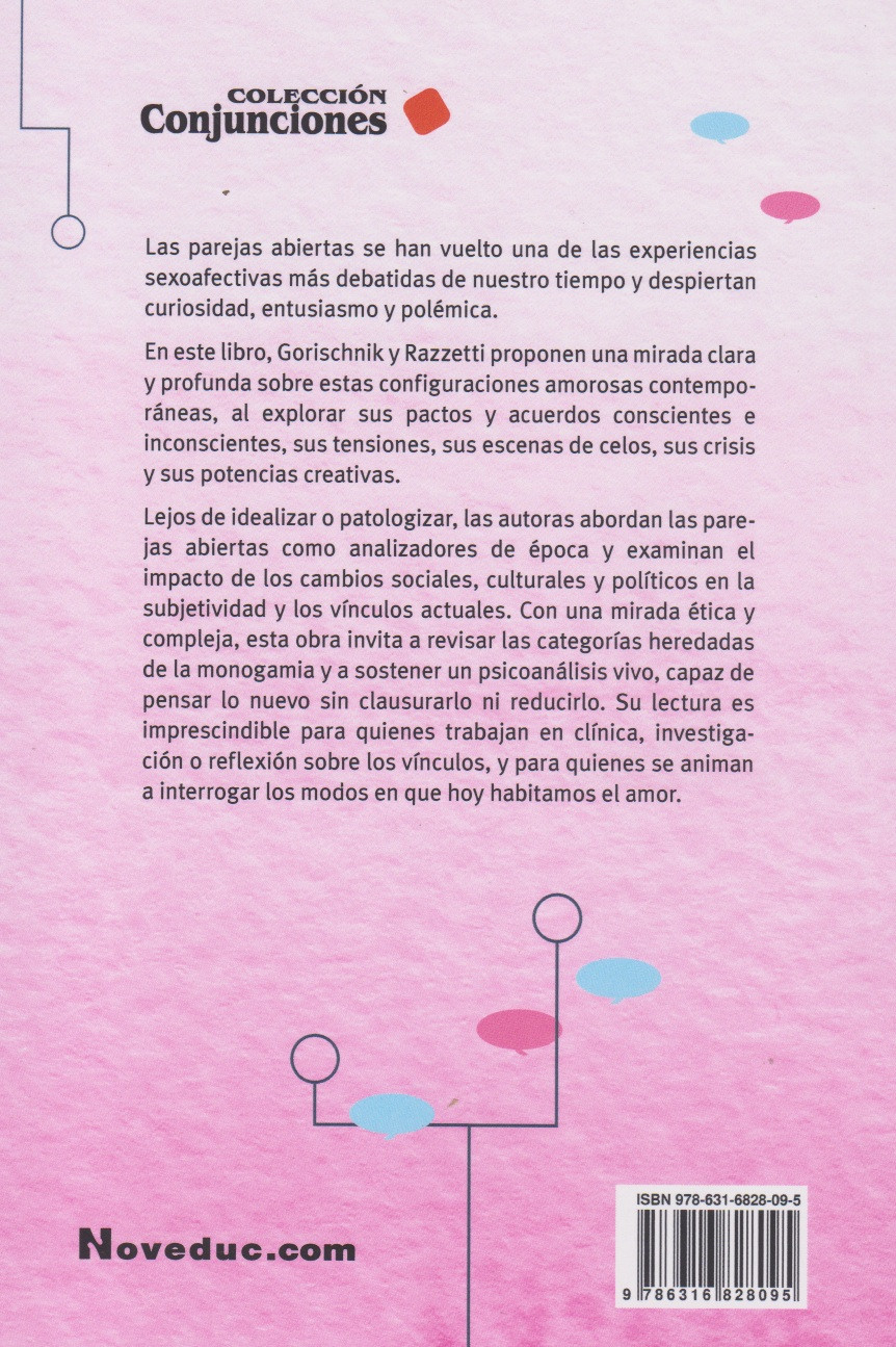 Las parejas abiertas se han vuelto una de las experiencias sexoafectivas más debatidas de nuestro tiempo y despiertan curiosidad, entusiasmo y polémica. En este libro, Gorischnik y Razzetti proponen una mirada clara y profunda sobre estas configuraciones amorosas contemporáneas, al explorar sus pactos y acuerdos conscientes e inconscientes, sus tensiones, sus escenas de celos, sus crisis y sus potencias creativas. Lejos de idealizar o patologizar, las autoras abordan las parejas abiertas como analizadores de época y examinan el impacto de los cambios sociales, culturales y políticos en la subjetividad y los vínculos actuales.