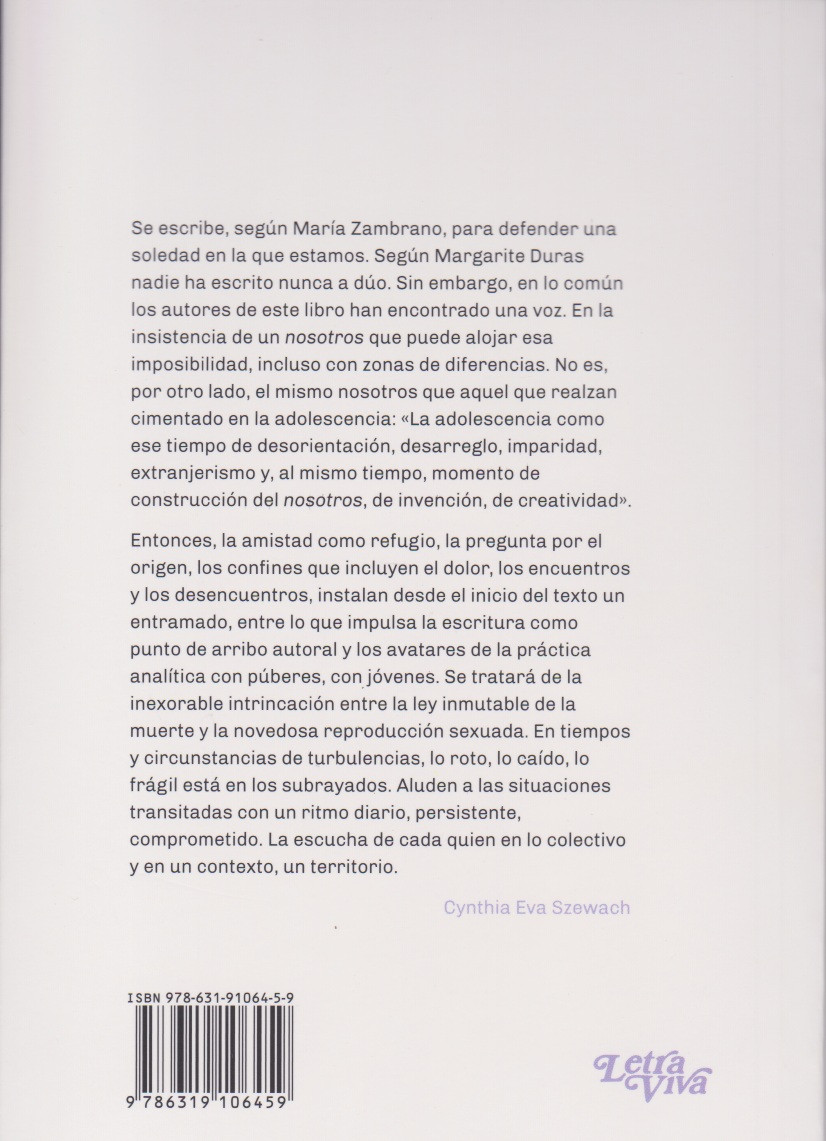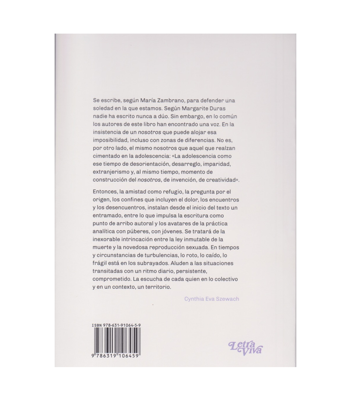 Se escribe, según María Zambrano, para defender una soledad en la que estamos. Según Margarite Duras nadie ha escrito nunca a dúo. Sin embargo, en lo común los autores de este libro han encontrado una voz. En la insistencia de un nosotros que puede alojar esa imposibilidad, incluso con zonas de diferencias. No es, por otro lado, el mismo nosotros que aquel que realzan cimentado en la adolescencia: «La adolescencia como ese tiempo de desorientación, desarreglo, imparidad, extranjerismo y, al mismo tiempo, momento de construcción del nosotros, de invención, de creatividad». Entonces, la amistad como refugio, la pregunta por el origen, los confines que incluyen el dolor, los encuentros y los desencuentros, instalan desde el inicio del texto un entramado, entre lo que impulsa la escritura como punto de arribo autoral y los avatares de la práctica analítica con púberes, con jóvenes. Se tratará de la inexorable intrincación entre la ley inmutable de la muerte y la novedosa reproducción sexuada. En tiempos y circunstancias de turbulencias, lo roto, lo caído, lo frágil está en los subrayados. Aluden a las situaciones transitadas con un ritmo diario, persistente, comprometido. La escucha de cada quien en lo colectivo y en un contexto, un territorio.