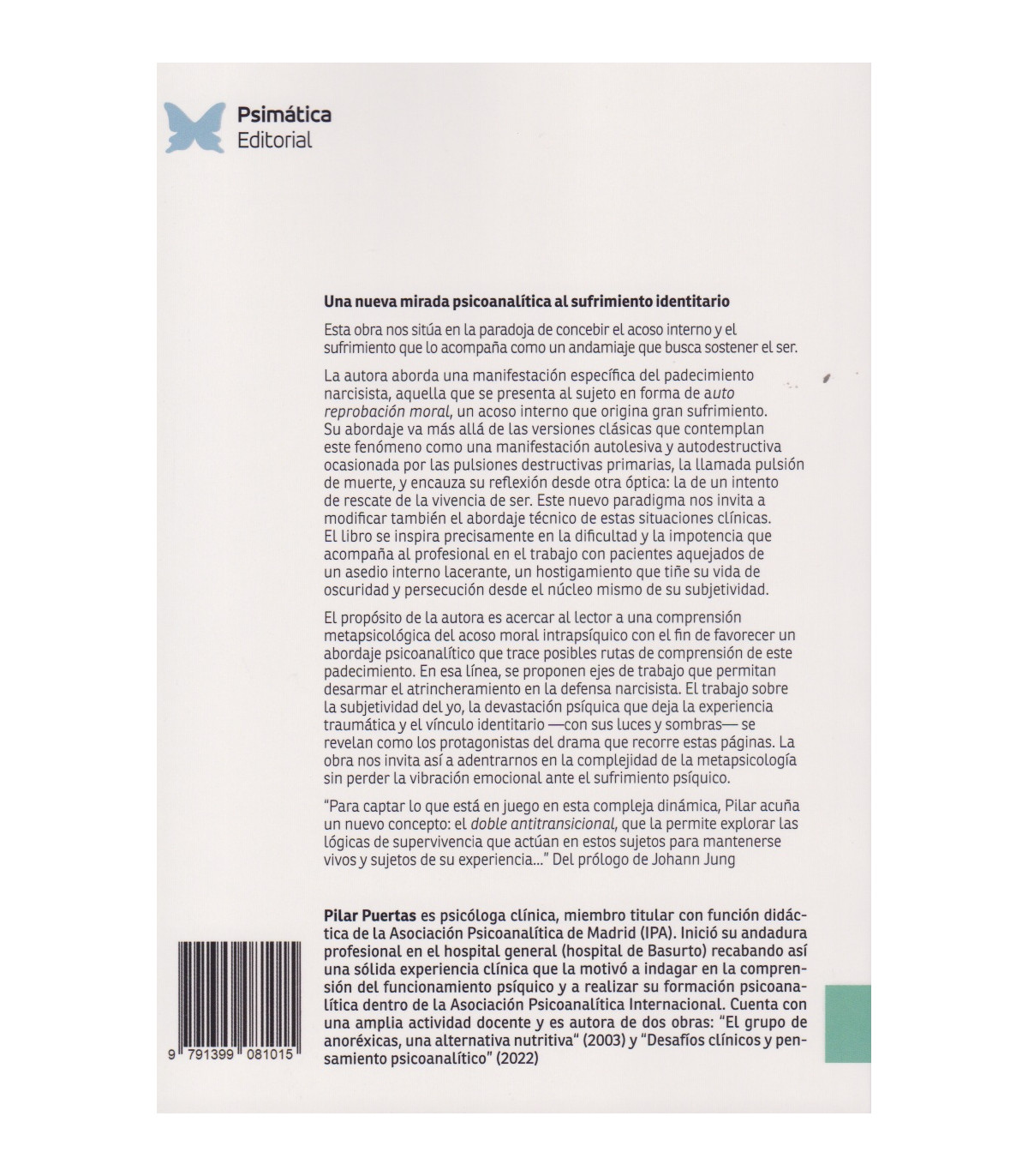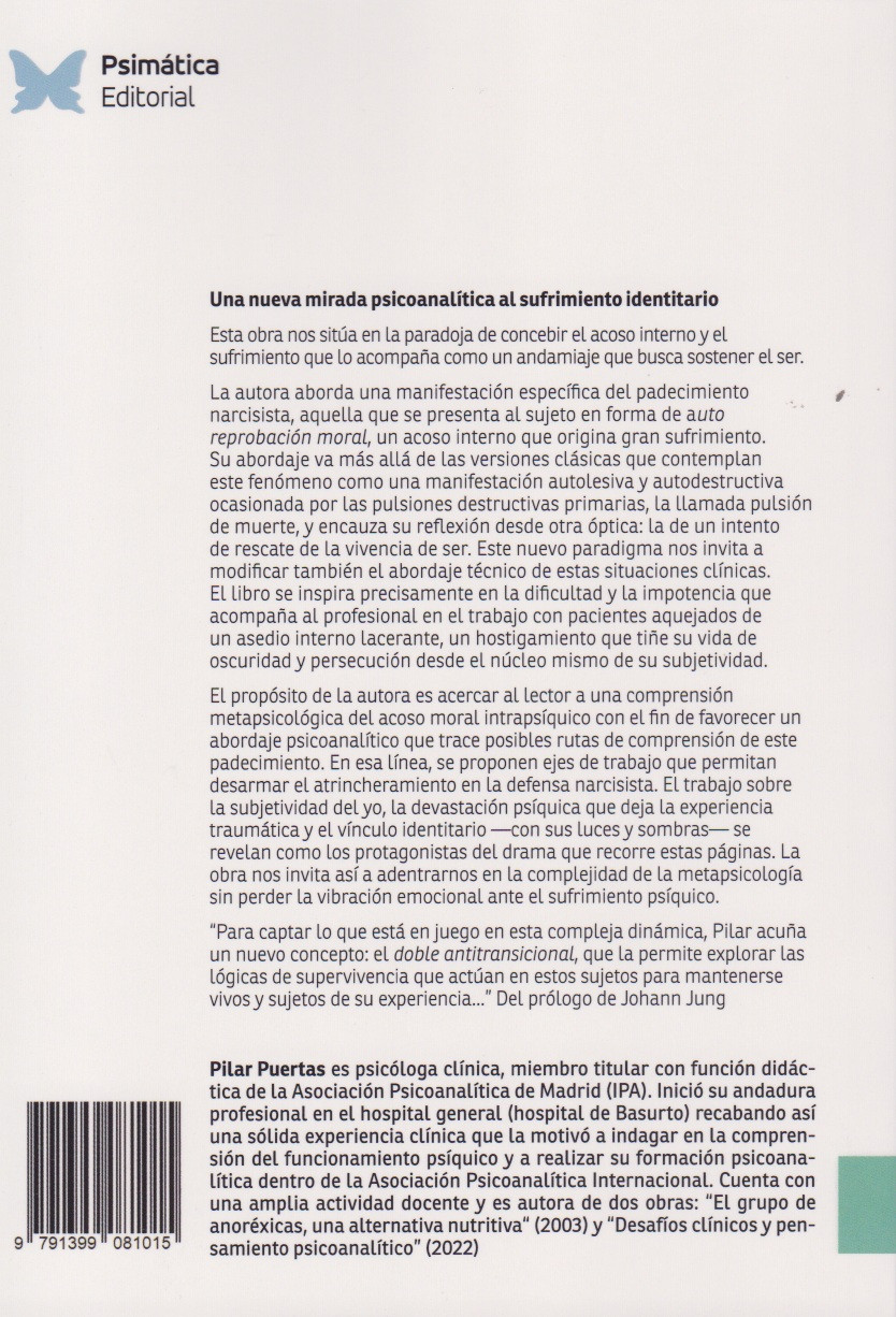 Esta obra nos sitúa en la paradoja de concebir el acoso interno y el sufrimiento que lo acompaña como un andamiaje que busca sostener el ser. La autora aborda una manifestación específica del padecimiento narcisista, aquella que se presenta al sujeto en forma de auto reprobación moral, un acoso interno que origina gran sufrimiento. Su abordaje va más allá de las versiones clásicas que contemplan este fenómeno como una manifestación autolesiva y autodestructiva ocasionada por las pulsiones destructivas primarias, la llamada pulsión de muerte, y encauza su reflexión desde otra óptica: la de un intento de rescate de la vivencia de ser. Este nuevo paradigma nos invita a modificar también el abordaje técnico de estas situaciones clínicas. El libro se inspira precisamente en la dificultad y la impotencia que acompaña al profesional en el trabajo con pacientes aquejados de un asedio interno lacerante, un hostigamiento que tiñe su vida de oscuridad y persecución desde el núcleo mismo de su subjetividad. El propósito de la autora es acercar al lector a una comprensión metapsicológica del acoso moral intrapsíquico con el fin de favorecer un abordaje psicoanalítico que trace posibles rutas de comprensión de este padecimiento. En esa línea, se proponen ejes de trabajo que permitan desarmar el atrincheramiento en la defensa narcisista. El trabajo sobre la subjetividad del yo, la devastación psíquica que deja la experiencia traumática y el vínculo identitario —con sus luces y sombras— se revelan como los protagonistas del drama que recorre estas páginas. La obra nos invita así a adentrarnos en la complejidad de la metapsicología sin perder la vibración emocional ante el sufrimiento psíquico. “Para captar lo que está en juego en esta compleja dinámica, Pilar acuña un nuevo concepto: el doble antitransicional, que la permite explorar las lógicas de supervivencia que actúan en estos sujetos para mantenerse vivos y sujetos de su experiencia...” Del prólogo de Johann Jung Pilar Puertas es psicóloga clínica, miembro titular con función didáctica de la Asociación Psicoanalítica de Madrid (IPA). Inició su andadura profesional en el hospital general (hospital de Basurto) recabando así una sólida experiencia clínica que la motivó a indagar en la comprensión del funcionamiento psíquico y a realizar su formación psicoanalítica dentro de la Asociación Psicoanalítica Internacional. Cuenta con una amplia actividad docente y es autora de dos obras: “El grupo de anoréxicas, una alternativa nutritiva“ (2003) y “Desafíos clínicos y pensamiento psicoanalítico” (2022)