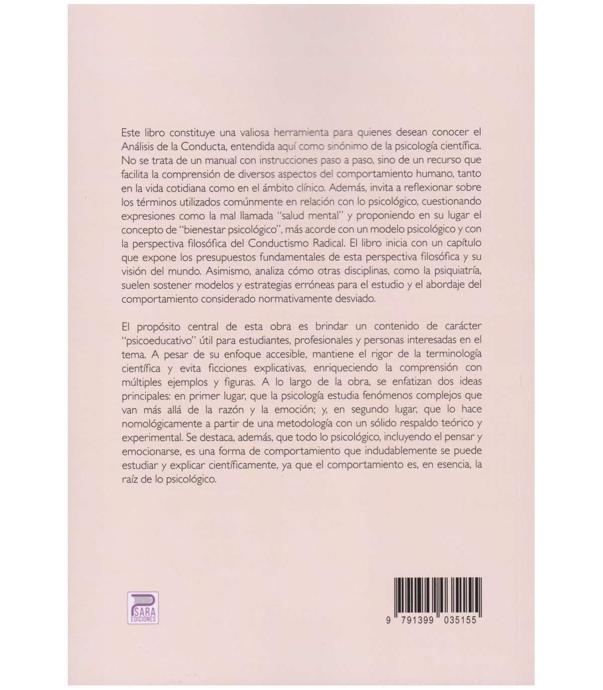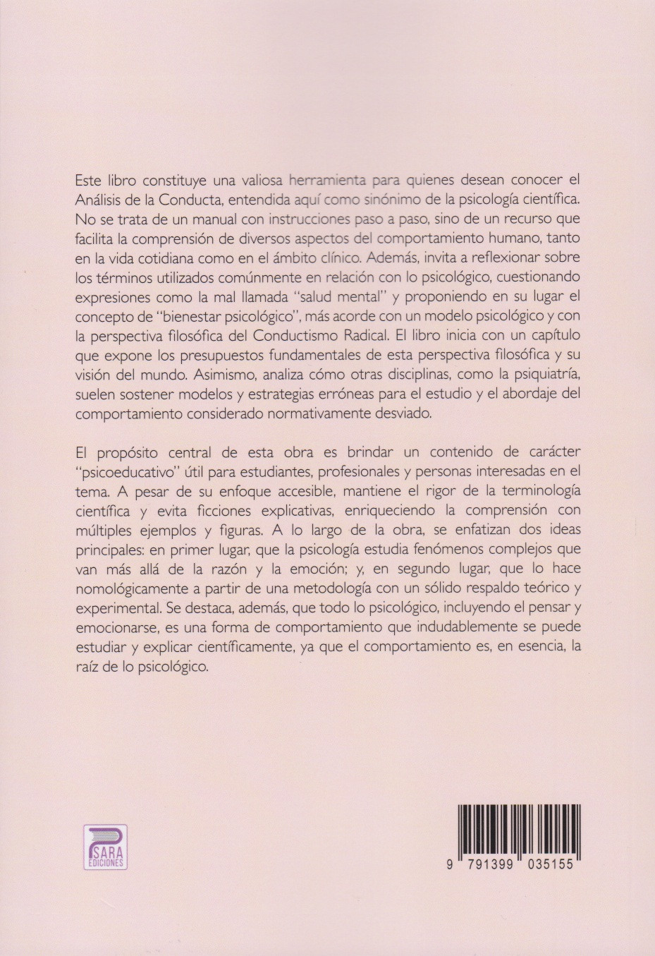 Este libro constituye una valiosa herramienta para quienes desean conocer el Análisis de la Conducta, entendida aquí como sinónimo de la psicología científica. No se trata de un manual con instrucciones paso a paso, sino de un recurso que facilita la comprensión de diversos aspectos del comportamiento humano, tanto en la vida cotidiana como en el ámbito clínico. Además, invita a reflexionar sobre los términos utilizados comúnmente en relación con lo psicológico, cuestionando expresiones como la mal llamada “salud mental” y proponiendo en su lugar el concepto de “bienestar psicológico”, más acorde con un modelo psicológico y con la perspectiva filosófica del Conductismo Radical. El libro inicia con un capítulo que expone los presupuestos fundamentales de esta perspectiva filosófica y su visión del mundo. Asimismo, analiza cómo otras disciplinas, como la psiquiatría, suelen sostener modelos y estrategias erróneas para el estudio y el abordaje del comportamiento considerado normativamente desviado. El propósito central de esta obra es brindar un contenido de carácter “psicoeducativo” útil para estudiantes, profesionales y personas interesadas en el tema. A pesar de su enfoque accesible, mantiene el rigor de la terminología científica y evita ficciones explicativas, enriqueciendo la comprensión con múltiples ejemplos y figuras. A lo largo de la obra, se enfatizan dos ideas principales: en primer lugar, que la psicología estudia fenómenos complejos que van más allá de la razón y la emoción; y, en segundo lugar, que lo hace nomológicamente a partir de una metodología con un sólido respaldo teórico y experimental. Se destaca, además, que todo lo psicológico, incluyendo el pensar y emocionarse, es una forma de comportamiento que indudablemente se puede estudiar y explicar científicamente, ya que el comportamiento es, en esencia, la raíz de lo psicológico.